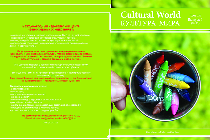 Воронкова А.С. - соискатель Санкт-Петербургского института культуры. Руководитель арт-подразделения Общества с ограниченной ответственностью «Кампо Верде Медиа Групп», г. Санкт-Петербург. SPIN-код: 6905-0479
